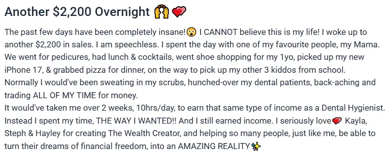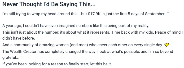 The Creator's Co. and The Wealth Creator program make no guarantee of specific financial outcomes or income results. Earnings and income representations are aspirational examples only and should not be interpreted as typical results. Success with The Wealth Creator depends on numerous factors including effort, skills, and marketplace conditions, which vary among individuals. Any testimonials or examples used are exceptional results, which do not apply to the average participant and are not intended to represent or guarantee that anyone will achieve the same or similar results.